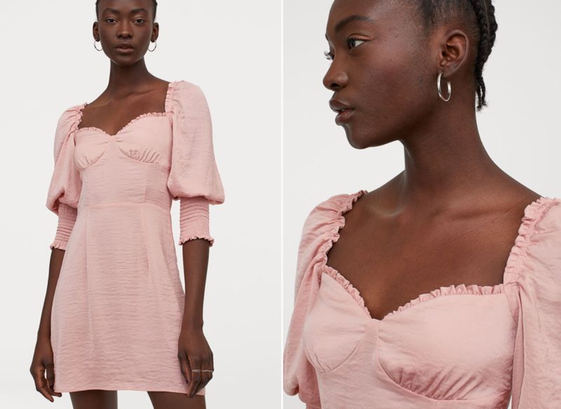 Disponible en tonalidad rosa empolvado y en negro, es un vestido corto en satén fluido que tiene escote corazón y busto con copas forradas preformadas. Tiene manga media abullonada con elástico fino y ribete de volante en los hombros. Además, tiene puños ceñidos fruncidos con ribete de volante, costura en la cintura y falda con ligero vuelo.