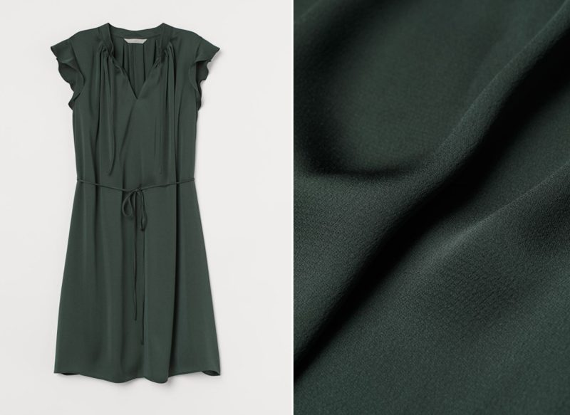 En este periodo de rebajas de H&M se pueden encontrar numerosas opciones para todos los gustos. Entre los vestidos rebajados se encuentra, a mitad de precio, destaca este vestido con tira de anudar en color verde caqui oscuro.