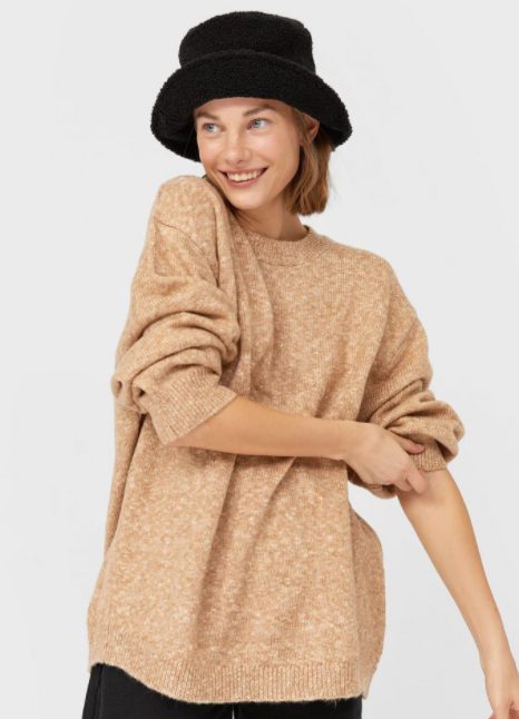 En Stradivarius está disponible un modelo con un sencillo cuello redondo, manga larga y en varios colores: rojo, gris mezcla, negro y beige. Combínalo con unos jeans, unos joggers o unos leggins. Está fabricado en 50% acrílico, 25% poliéster, 25% algodón, y ahora se puede comprar por solo 12,99 euros.