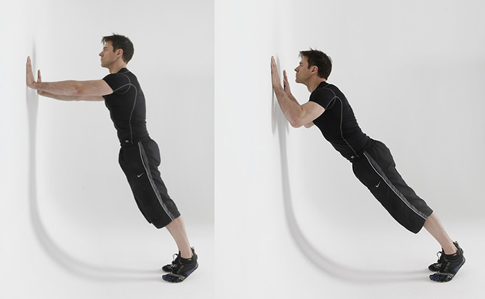 Las flexiones en la pared son una buena alternativa para reemplazar a las mencionadas anteriormente. Para la postura inicial apoya tus manos en la pared y déjate caer manteniendo el cuerpo totalmente erguido. El suelo, la pared y tu cuerpo deben formar una especie de triángulo. Una vez que estés en esa posición comienza a levantarte haciendo fuerza con tus brazos y vuelve a bajar. Las manos deben estar en contacto con la pared en todo momento. 3 series de 10 repeticiones son suficientes.