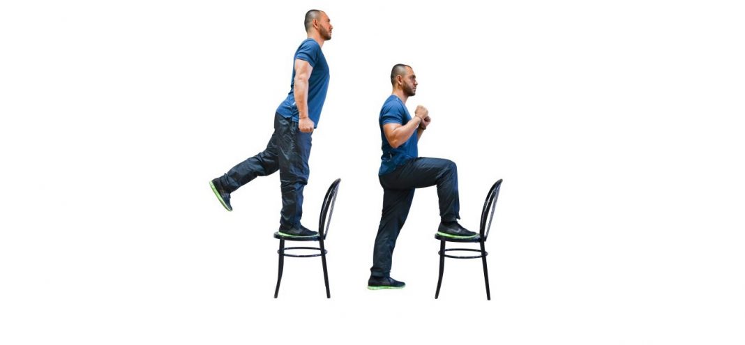 Para la subida de escalón lo ideal es contar con un cajón. No obstante, es un elemento que casi nadie tiene en la casa y no merece la pena comprarlo solo para un ejercicio. Por lo tanto, puedes utilizar cualquier silla o banco. En el deporte hay múltiples alternativas.