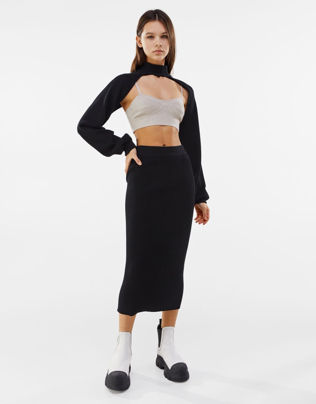 Dejamos las faldas en formato mini, y es el momento de tirar de tela. Y es que aunque el frío nos da un respiro, ya sabemos que luego por la noche sigue refrescando. Ahora nuestra apuesta es por estas faldas En concreto por una falda en punto de canalé supersuave con acabado cepillado. Modelo de talle alto con cintura elástica y aberturas laterales.