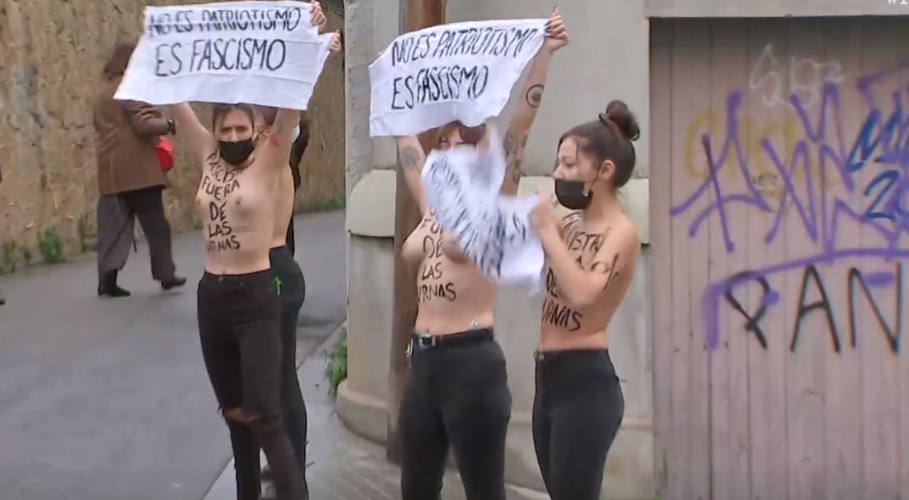 Las mujeres se habían colocado en la entrada del colegio para recibir al candidato de VOX por Barcelona. «No es patriotismo, es fascismo«, rezan los lemas escritos en tres grandes pancartas, mientras piden echar a Vox de las urnas.