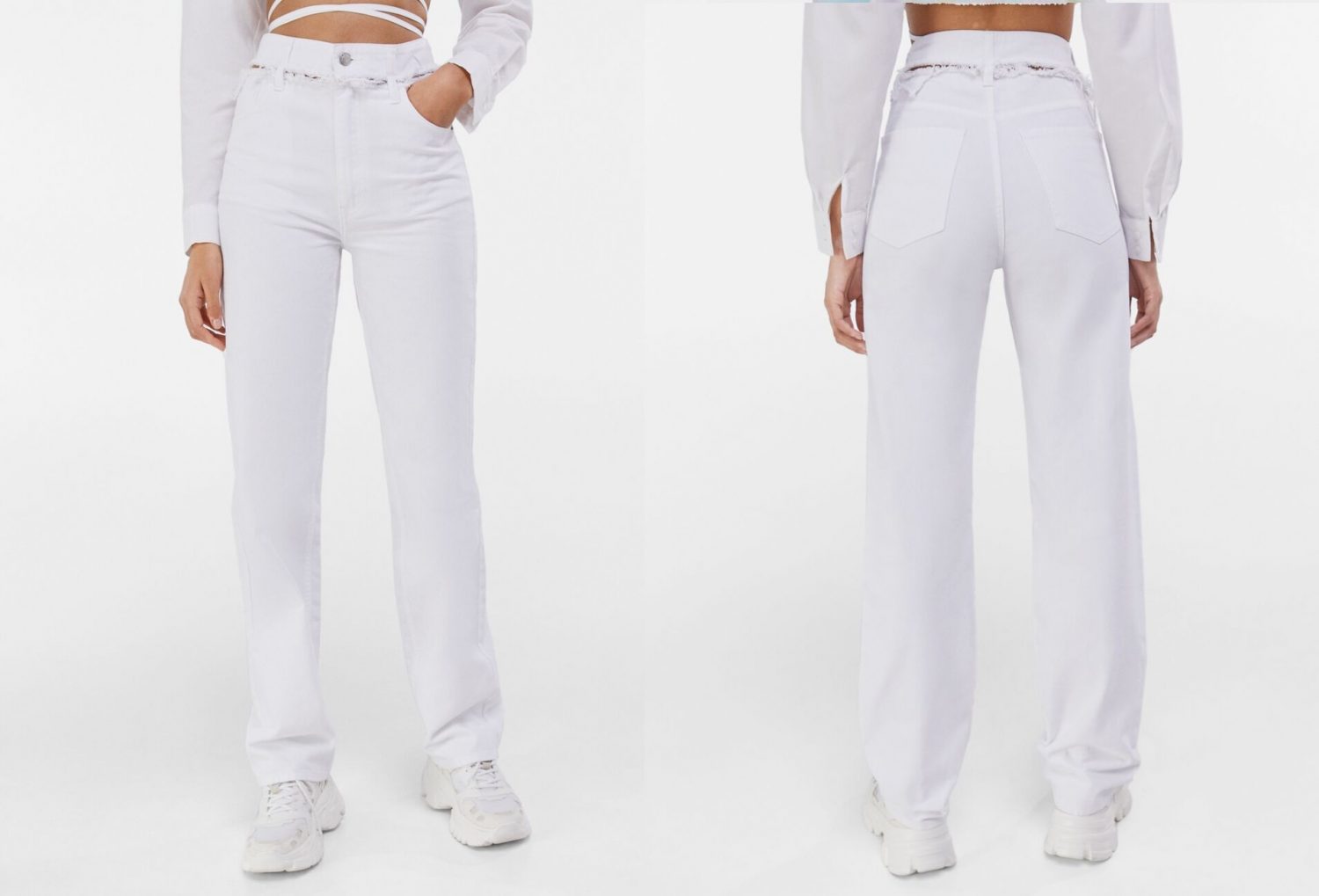 Estos vaqueros jeans straight high waist cut out color blanco es una de las prendas mas originales de la nueva colección de Bershka. Unos vaqueros que valen tanto para una reunión o entrevista laboral como para una salida nocturna con amigas. Además son muy cómodos y frescos. Es un pantalón ‘care for fiber’ que está hecho en gran parte de algodón orgánico. El precio es 25,99 euros.
