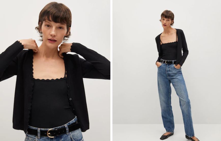 Para un look informal pero con estilo este cárdigan con terminaciones festoneadas es una muy buena alternativa. Puede usarse con un vaquero o con un vestido. Es un abrigo liviano y elegante. Creativo diseño con 55 cm de largo de espalda. Posee un cierre con botones y su composición es 50% viscosa, 28% de poliéster y 22% poliamida. Viene en crudo y también en negro. Su valor es más que accesible. Cuesta 19,99 euros y puedes comprar online y retirar gratuitamente en cualquier punto de venta de Mango. La marca barcelonesa tiene cientos de tiendas a lo largo y a lo ancho de todo el territorio español.