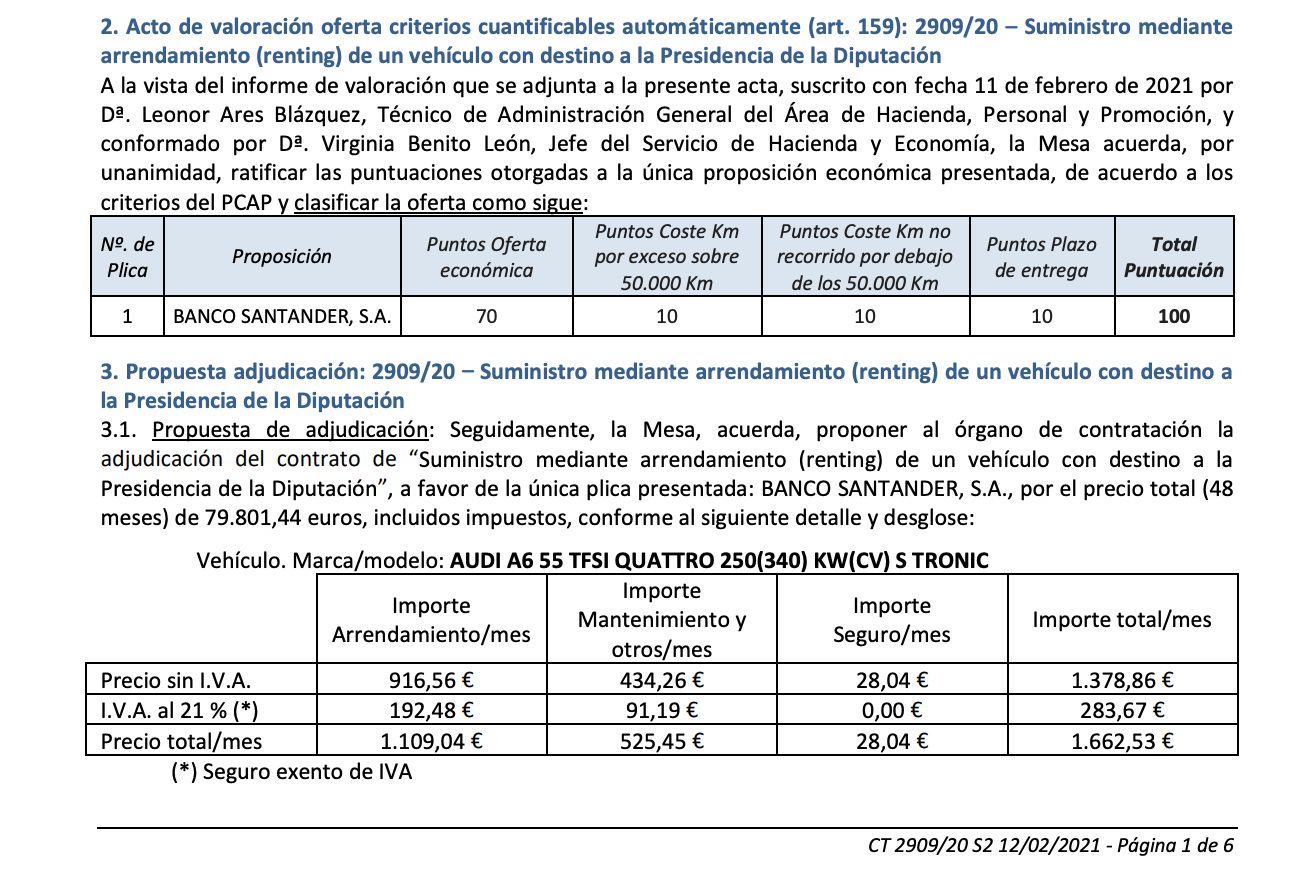 No es el A8 del presidente del Gobierno, Pedro Sánchez, pero tampoco se queda atrás el modelo que se ha agenciado Íscar. «Seguidamente, la Mesa, acuerda, proponer al órgano de contratación la adjudicación del contrato de “Suministro mediante arrendamiento (renting) de un vehículo con destino a la Presidencia de la Diputación”, a favor de la única plica presentada: BANCO SANTANDER, S.A., por el precio total (48 meses) de 79.801,44 euros, incluidos impuestos», detallan en el documento oficial al que ha tenido acceso este medio y en el que han aprobado el alquiler de este Audi A6.