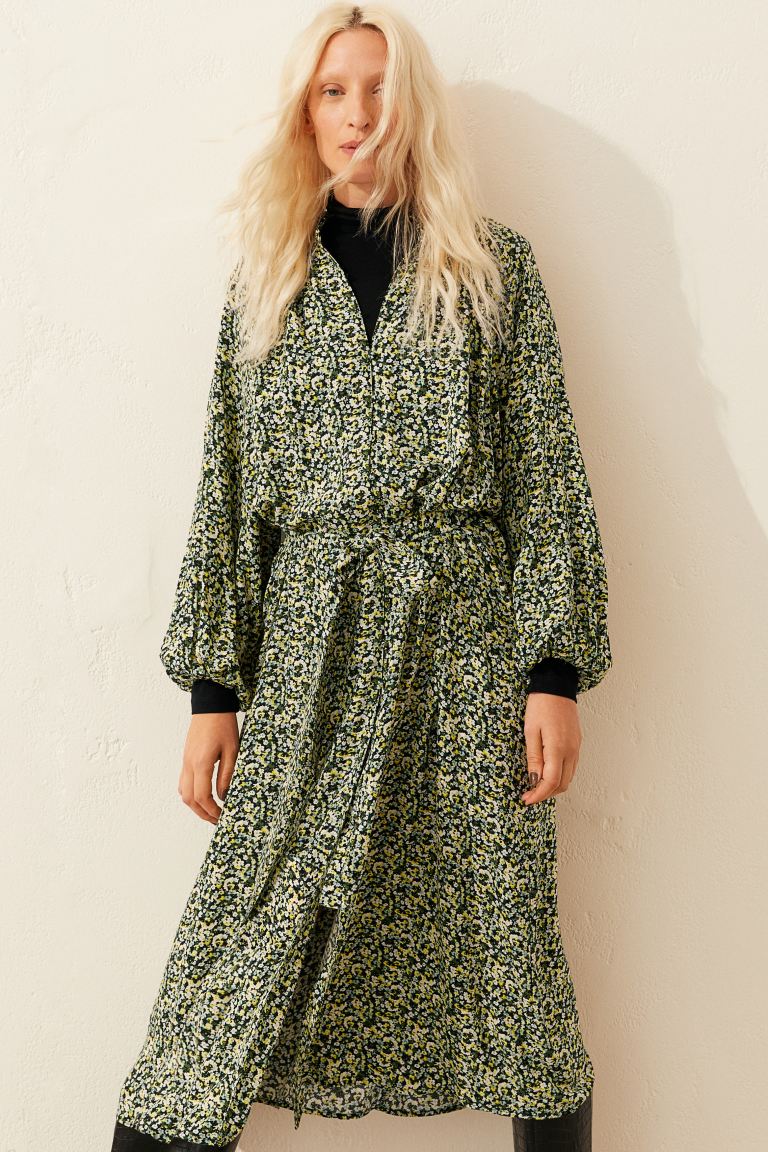Nuestra primera opción de vestidos largos que puedes encontrar en el H&M es este midi de viscosa con cuello elevado fruncido corto y botones revestidos delante. Además tiene mangas raglán largas y puños finos con botón revestido. Lleva la costura en la cintura con cinturón de anudar extraíble y falda con ligero vuelo y suave caída. Y va sin forrar.