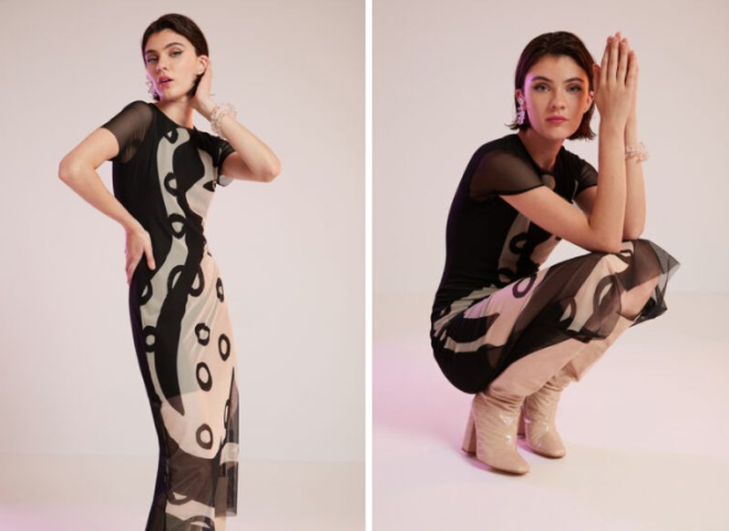A la venta por 119,95 euros, dispone de un gran print posicional con la silueta de un gato a lo largo del vestido, lo que hace que sea original y con mucho estilo. Tiene apertura en el lateral frontal para dejar entrever la pierna y dispone de manga corta.