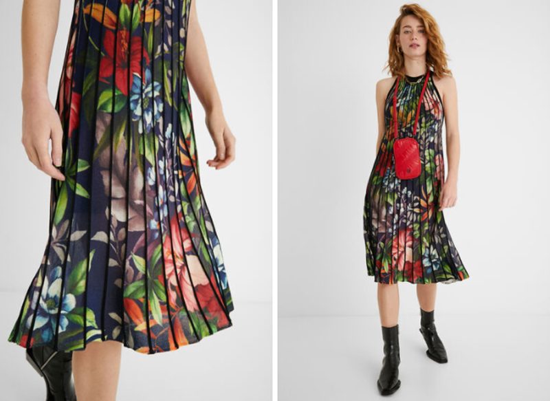 Si prefieres una opción llena de color y al más puro estilo Desigual, este vestido plisado flores es un modelo que, sin lugar a dudas, debes tener presente. Además, su precio es de 89,95 euros hace que sea aún más interesante.