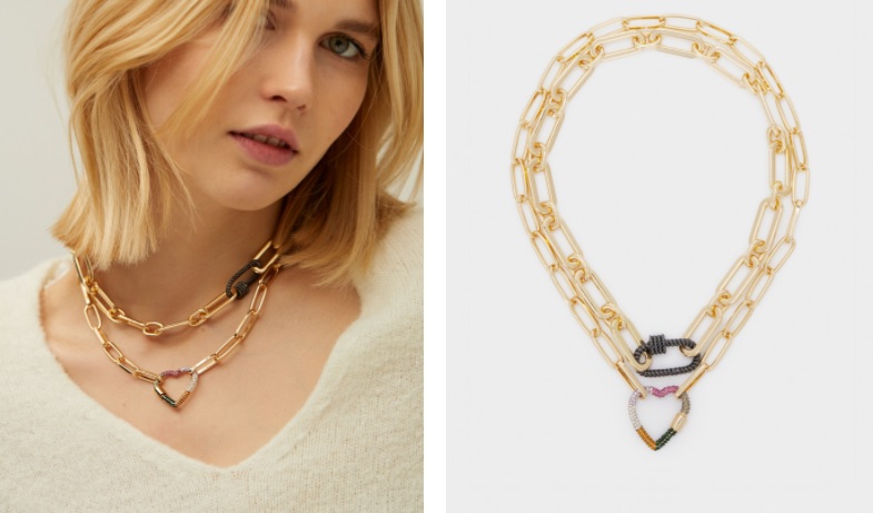 Si bien los pendientes parece que han optado por el diseño más amplio, los collares no se quedan atrás. Por eso, destacamos este collar o collares, porque como vemos se trata de un conjunto de ellos con eslabones amplios y finos que darán paso a un detalle final.
