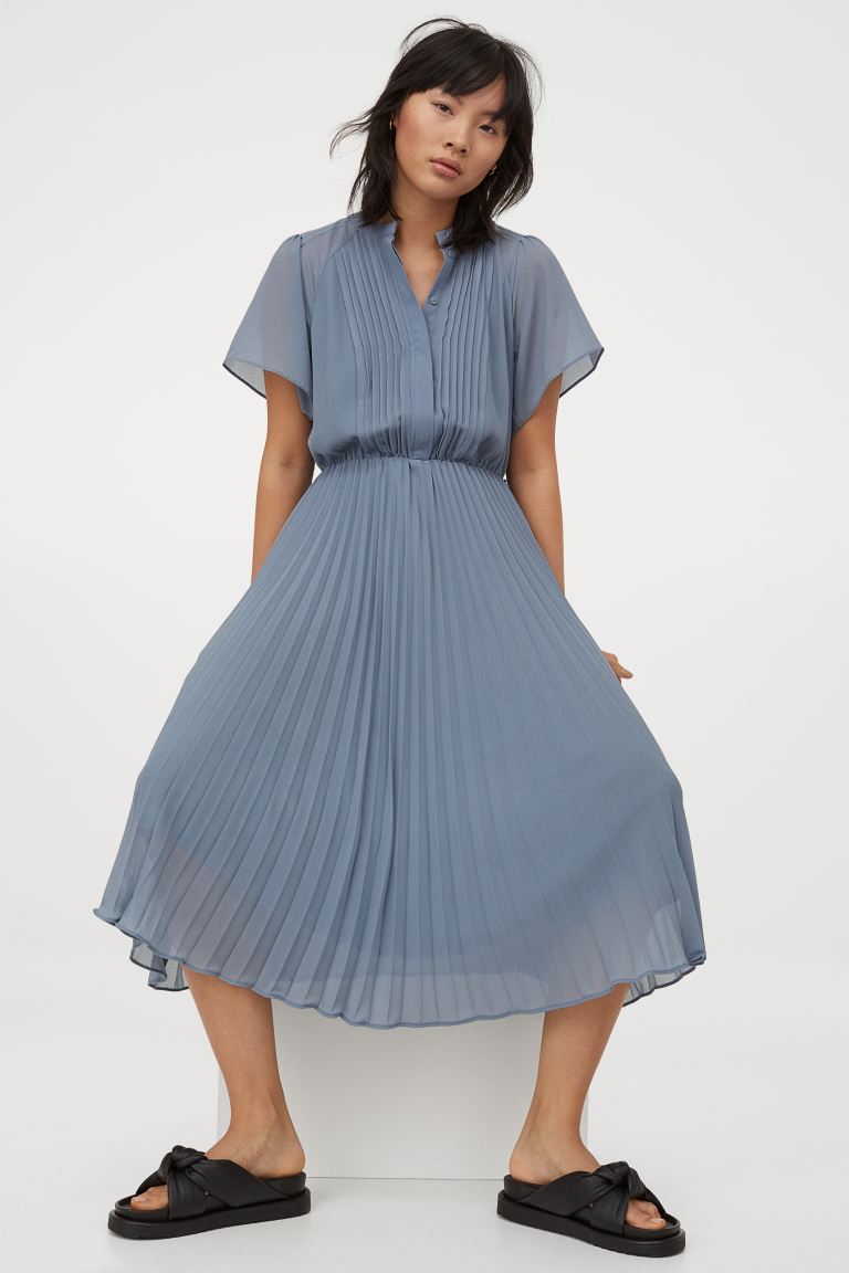 Se trata de un vestido midi en gasa plisada de poliéster reciclado. Modelo de manga corta con cuello redondo, cierre de botones oculto y jaretas en delantero y hombros. Es elástico y va oculto en la cintura y cinturón de anudar extraíble. Lleva el forro de satén.