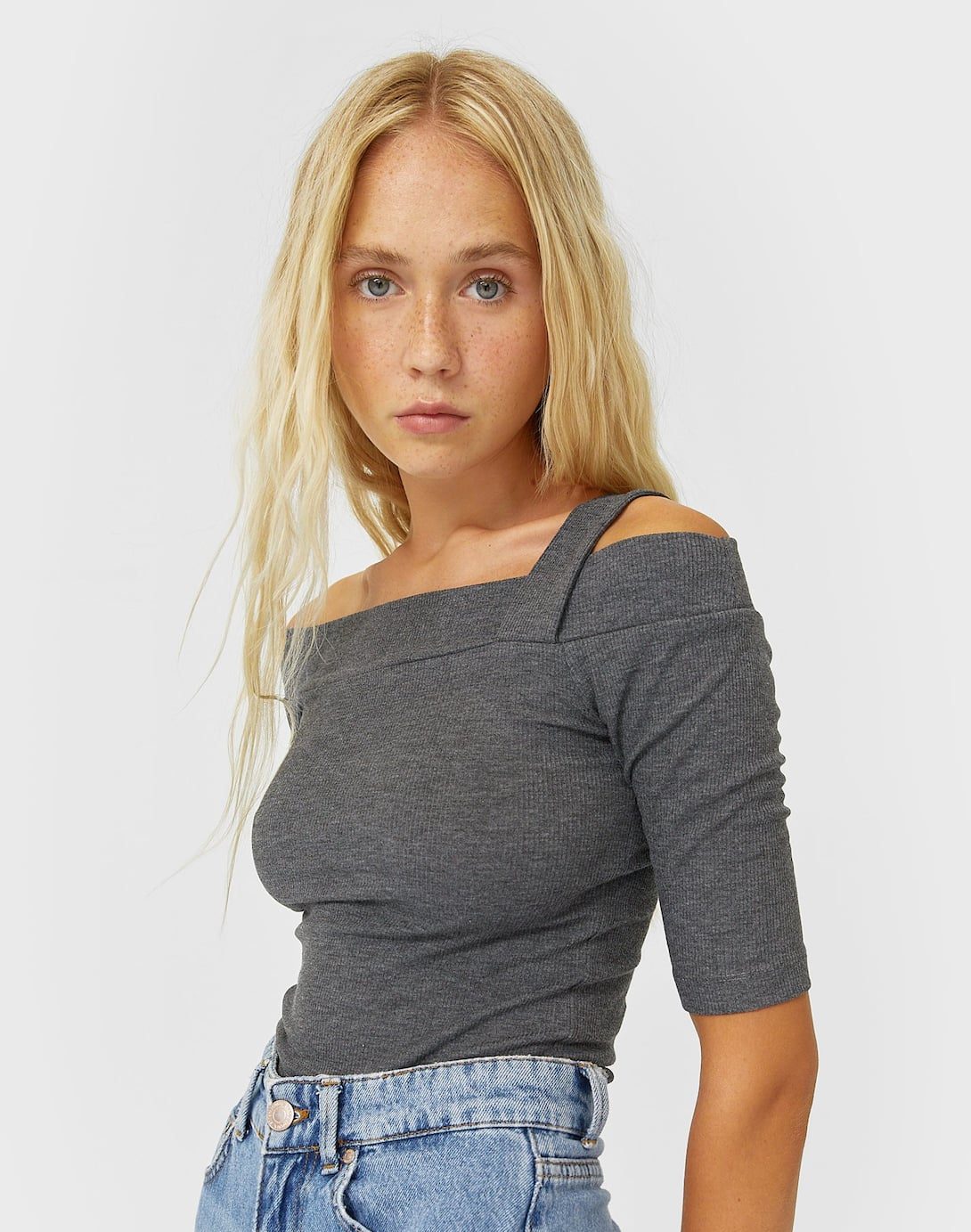 Uno de los que más nos han gustado, también por su precio, de Stradivarius, es este top gris de corte asimétrico con el que podremos enseñar los hombros de forma muy original. Además, también lo encontramos en otros tonos como el lila o el piedra, por lo que combinará con todas las prendas de tu armario.