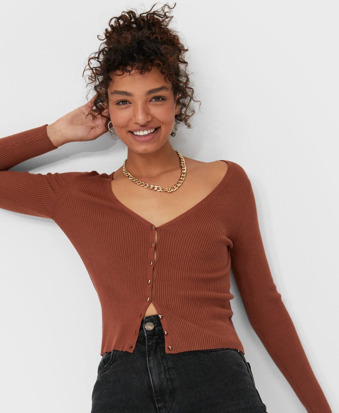 En este caso, tenemos que destacar esta chaqueta de punto con botones en la parte delantera de Stradivarius. Un básico que todos debemos tener en nuestro armario y que podemos encontrar en tonos neutros, como el teja, para completar cualquiera de nuestros looks.