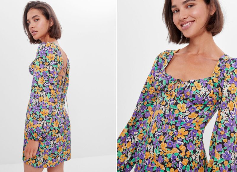 Es un vestido que combina flores de diferentes colores, con predominio de flores de color lila y amarillo, además de las hojas de color verde sobre un fondo negro. Este vestido de Bershka se encuentra con una gran rebaja, y en lugar de 29,99 euros, se puede comprar por solo 3,99 euros (-86%).