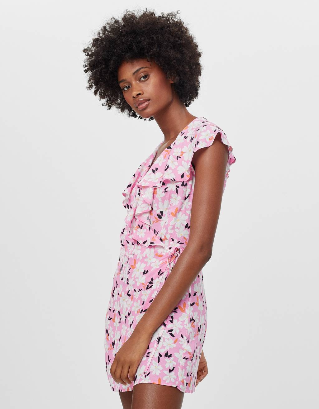 Los monos llevan varios años siendo tendencia, y ojalá no se vayan nunca porque son una excelente alternativa a los vestidos. Son igual de femeninos y elegantes, pero con comodidad añadida de que la parte de abajo es un pantalón holgado en vez de una falda, algo que se agradece sobre todo en las tallas muy cortas. Esta propuesta de Bershka es un diseño cruzado que cierra en un lateral con una lazada. El escote en forma de pico está ribeteado con unos preciosos volantes decorativos, que le dan un toque más vistoso y especial. El cuello es tipo marinero, con unos bonitos pliegues que caen sobre los hombros. Es de color rosa con flores blancas y pinceladas en naranja que nos recuerdan a los cerezos en flor tan característicos de la primavera. Te lo puedes llevar por un precio escandaloso de 3,99 €.