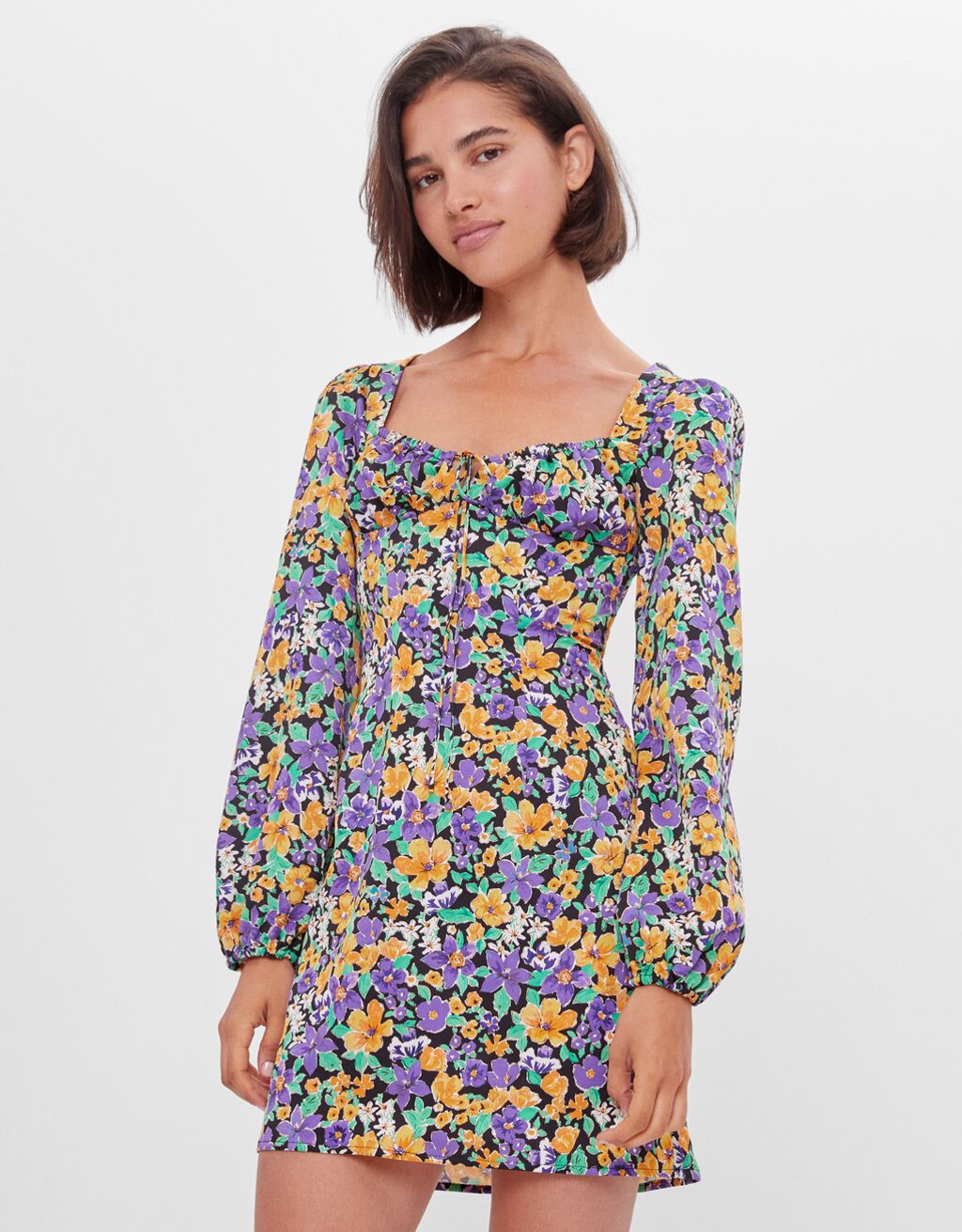 Las flores hacen acto de presencia en los vestidos, pues es una prenda muy vinculada a la primavera y al verano, cuando apetece descubrirse las piernas y dejarlas al aire libre. Se trata de estampados alegres, femeninos y que no necesitan nada más para conseguir que un estilismo sea arrebatador. En Bershka también han apostado por este tipo de tejidos, con colores más bien llamativos. Porque este año, más que nunca necesitamos colorido e intensidad. Uno de los que más éxito están teniendo este vestido de manga larga, con escote cuadrado y en forma corpiño, que se ciñe con un cordón en el pecho. En la parte de la espalda tiene un bonito y espectacular escote con cintas cruzadas. Las mangas son abollonadas y la silueta es ligeramente entallada, con la falda corta. Está elaborado con 100% poliéster y cuesta solo 3,99 €.