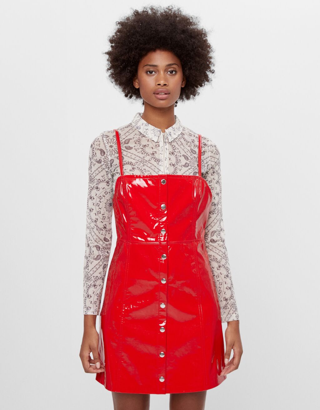 ¿Buscas algo único, que te distinga de los demás y que llame verdaderamente la atención? Con este vestido de charol de Bershka lo conseguirás. Un diseño que podríamos definir como retrofuturista, de charol rojo brillante y con botones, a modo de pichi, es sin duda una prenda solo apta para chicas atrevidas. Aunque sea tan llamativo, las opciones de combinación que ofrece son bastantes, ya que puede funcionar como un peto, y podemos jugar con las prendas que ponemos por debajo. Un jersey negro de cuello alto, una blusa blanca con mangas abullonadas, piernas al aire, medias, botas, zapatillas. ¡Deja volar la imaginación! Lo mejor es que solo cuesta 3,99 €.