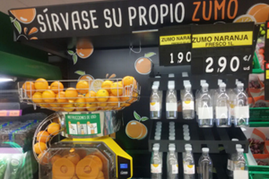 Otro de los productos que más gusta entre los empleados de Mercadona es su zumo de naranja recién exprimido. El grupo valenciano incorporó este servicio hace ya cinco años que goza de mucho éxito en los clientes habituales y los empleados. Situado en el pasillo de frutería, se trata de una máquina de autoservicio a partir de la cual, y adquiriendo unas botellas de vidrio, situadas en el mismo espacio, pueden hacerse con un litro o medio litro de zumo recién exprimido. El uso de la máquina es muy sencillo y es algo bastante habitual en supermercados de Estados Unidos y que se está implantando en muchas otras marcas de supermercados en nuestro país.