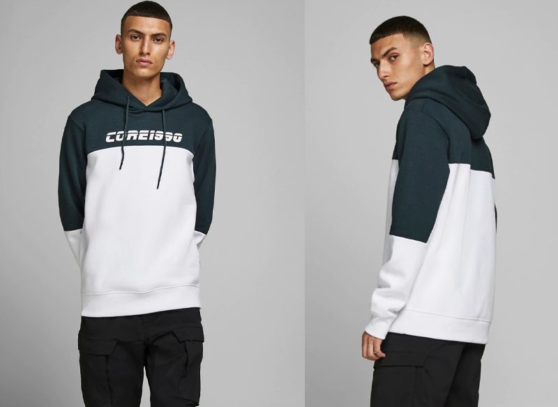 Es un modelo de color blanco y verde oscuro con capucha y cordones que lleva un print Jack & Jones CORE; apareciendo a contraste en la parte verde el texto «CORE1990». La capucha es ajustable.