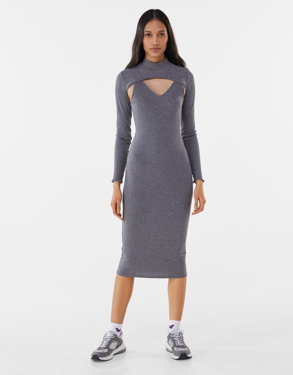 Con los primeros rayos de sol este vestido Rib midi manguitos puede ser perfecto. Por 19,99 euros puedes renovar tu armario. La combinación es perfecta como puedes ver con esas hombreras que te recuerdan a un jersey pero luego van llegando los diferentes puntos diferentes.