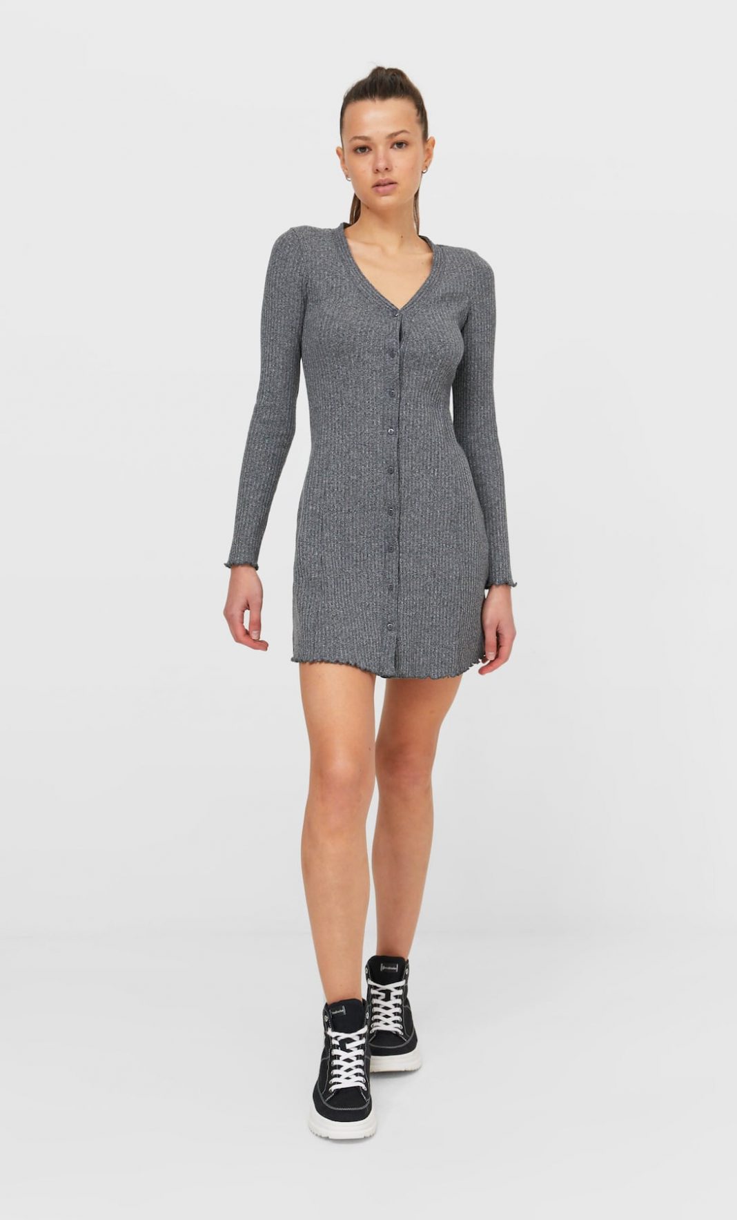 No solo está disponible en el color gris marengo de la imagen, también lo puedes encontrar en otros. SU precio es lo mejor porque es de 19.99 euros en su página web. Nuestra recomendación para combinarlo es con unos botines deportivos en tejido. Un vestido ideal para estar elegante pero al mismo tiempo con un toque sensual.