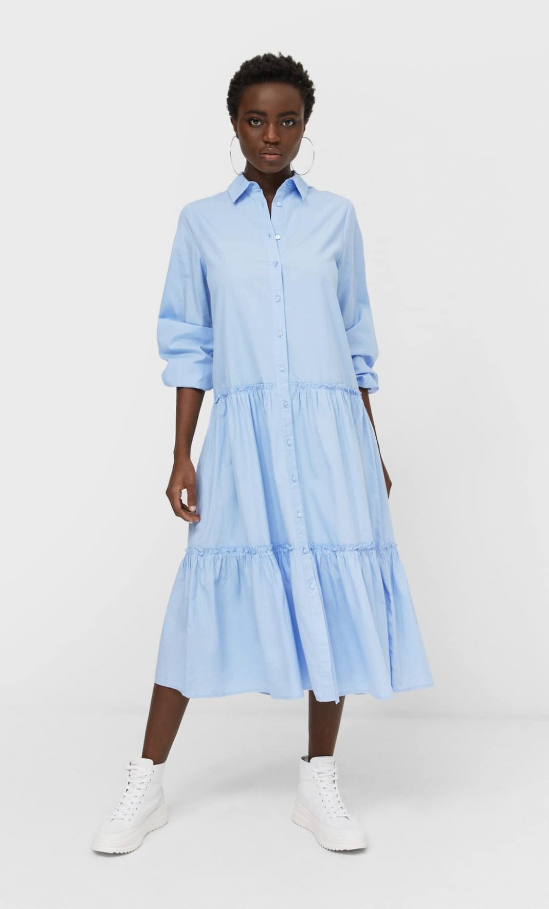 Además tiene un cierre frontal con botones y un bajo acabado en volantes, que le da este toque tan cuqui que nos evoca al pasado de la infancia. El vestido camisero popelin cuesta 25,99 euros y la única pega es que solo lo puedes disfrutar en azul celeste. El look lo puedes completar con una bandolera y de calzado, unos botines planos acorchados.