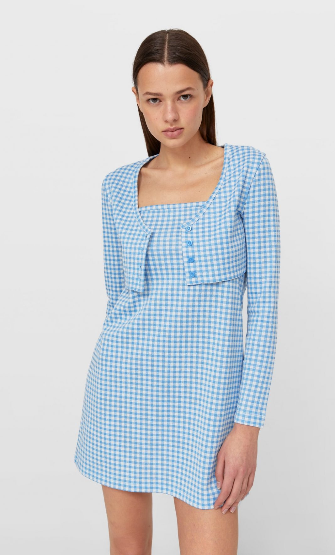 Aunque sin duda, lo mejor es el detalle de bolero a tono con cierre frontal con botones. La verdad es que este vestido de Stradivarius se puede convertir en la envidia de todas tus amigas. Además de este azul de la imagen, la prenda está disponible en varios colores, por ejemplo en lila o en verde.