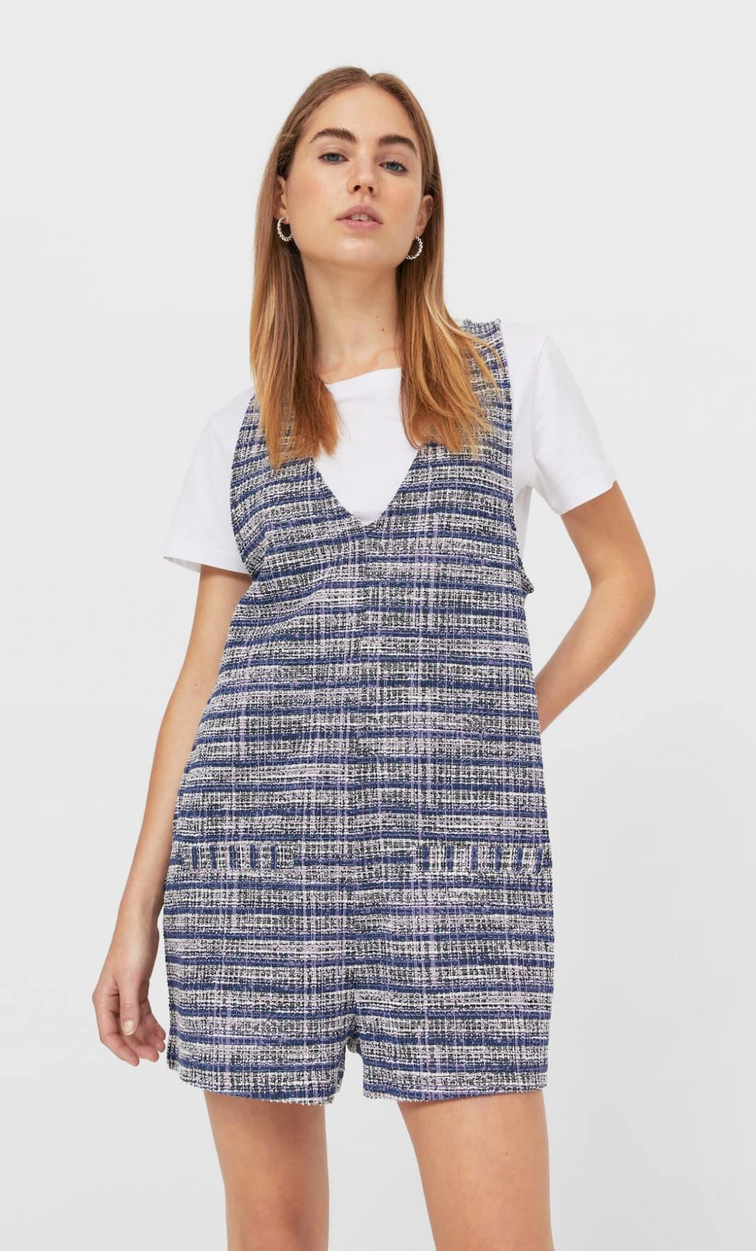 En la nueva colección de vestidos de primavera de Stradivarius también incluimos este fabuloso mono a cuadros, que es ideal para los primeros rayos de sol y las primeras salidas. Un mono corto de escote pico y tirantes que estará deseando ir a tu armario.