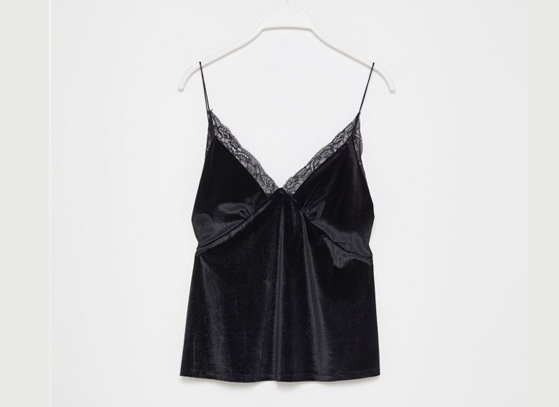 Otra de las camisetas bonitas que puedes encontrar en Sfera a muy buen precio es esta camiseta tirantes terciopelo, un modelo que cuenta con encaje y que se encuentra disponible en tallas S, M y L.