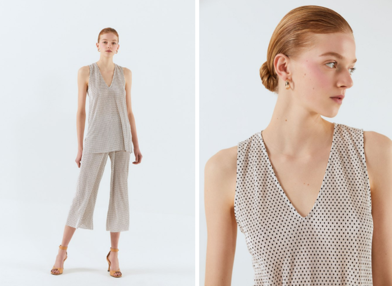 Si estás buscando una nueva camiseta para lucir estilo con la llegada del buen tiempo, esta camiseta plisada estampada es una de las opciones más recomendadas. Se encuentra disponible tanto en color beige con topos negros como en negro con topos blanco.