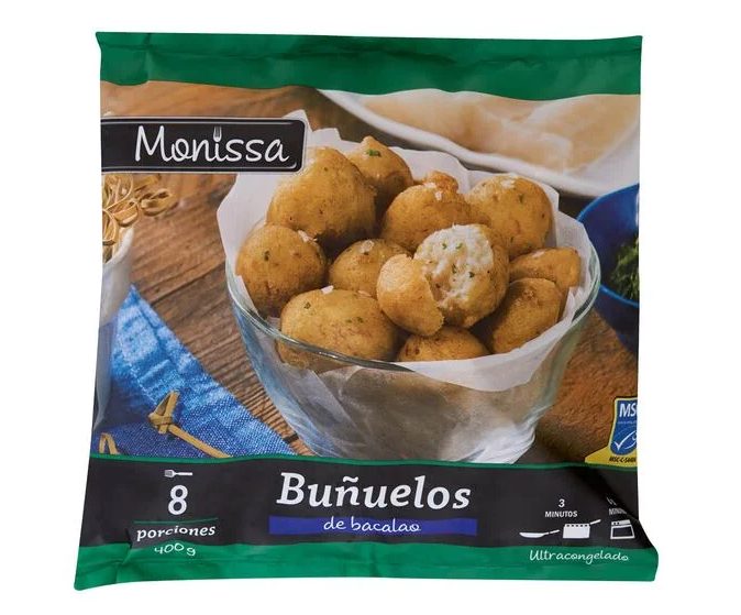 Nunca está de más tener algunos congelados en casa de los que tirar en momentos de apuro. Como por ejemplo unos buñuelos de bacalao de Lidl, de su marca Monissa, que ofrece congelados de todo tipo de excelente calidad. La materia prima de estos buñuelos procede de la pesca sostenible certificada MSC, y están preparados según la receta tradicional de nuestras abuelas. Simplemente hay que freír sin descongelar en aceite muy caliente hasta que estén dorados, y listos para comer. Se pueden acompañar por ejemplo de un rico arroz. Cada paquete contiene 8 porciones y sale por 0,99€.