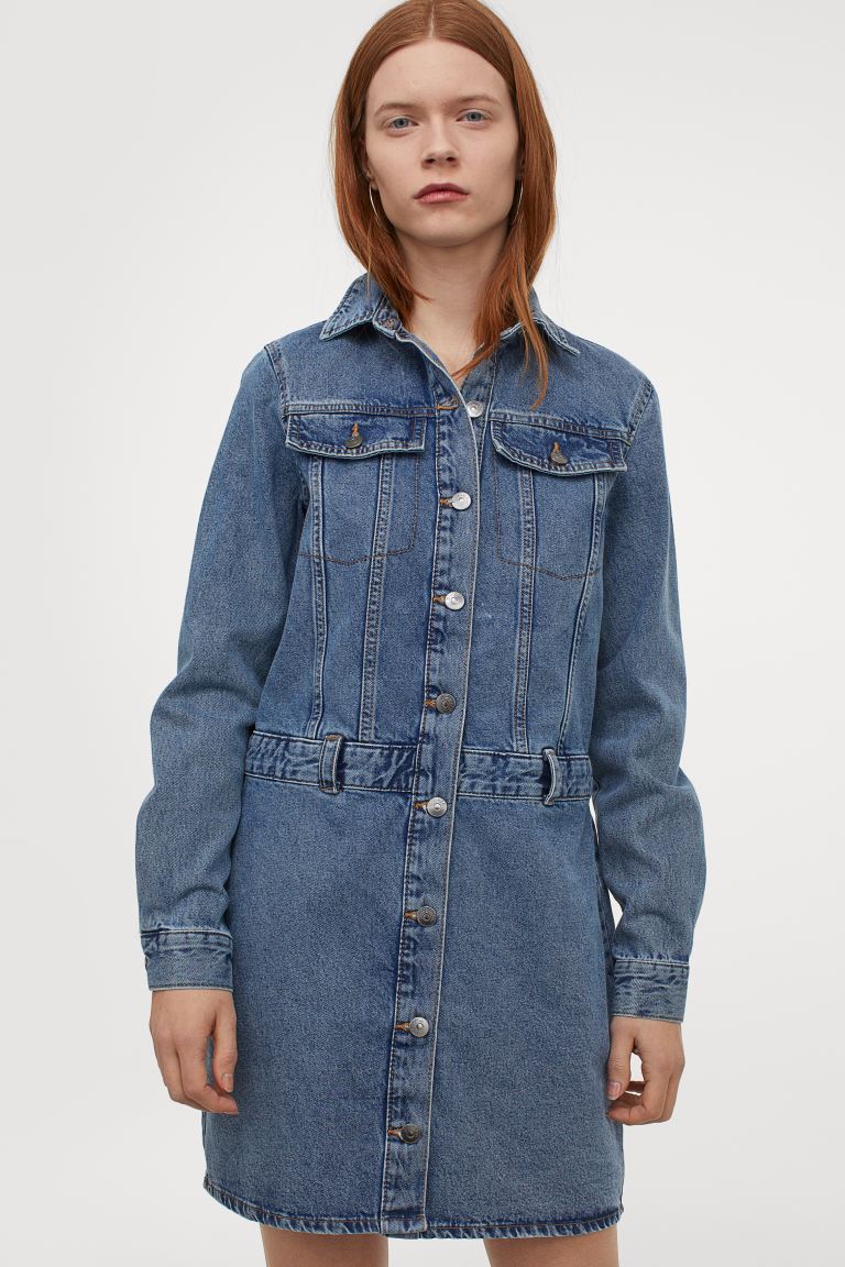 Otra prenda que no podemos dejar pasar dentro de la nueva colección de vestidos de H&M es este, realizado por completo en tejido denim. Su corte recto y su tono lavado, nos transportan a la era más nostálgica de lo 90.