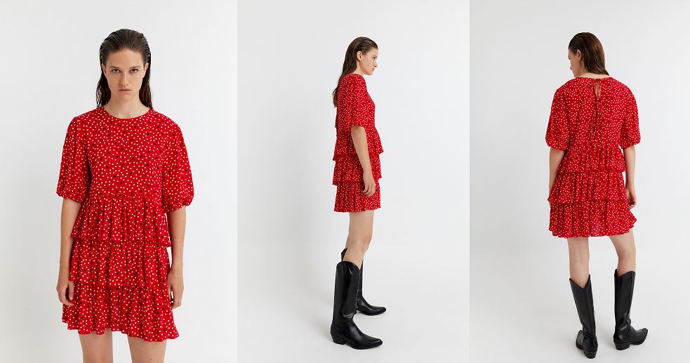 Los lunares volverán ser tendencia la próxima primavera. Este vestido corto rojo de Sfera es de los más bonitos y versátiles que verás en este artículo. Y lo mejor de todo, está tirado de precio. Un outfit alegre con un estampado que nos recuerda a los tradicionales trajes de gitana de las ferias andaluzas. Anteriormente, su precio era 35 euros, pero dado que quedan muy pocas unidades, Sfera ha bajado su precio a 10,75 euros. Una ganga. Su tejido es 100% viscoso. Además, va genial con una chaqueta de cuero, ya sea puesta o atada a la cintura. Sabemos bien que al inicio de la primavera los cambios de temperatura suelen ser muy abruptos y es muy habitual que nos estemos poniendo y quitando el abrigo a cada rato.