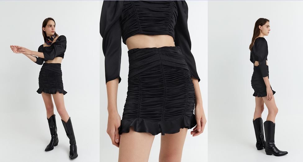 Otro precioso diseño de Sfera. Esta falda negra frunce puede combinarse con cualquier cosa y verdaderamente muy práctica por su cierre con cremallera. Además es sumamente cómoda. Eso si, tienes que tener cuidado ya que al estar compuesta de poliéster en su totalidad es una prenda muy delicada. No puede meterse en la lavadora ni secarse a más de 50ºC. Tampoco se debe limpiar con lejía u otros blanqueadores ni planchar a más de 150ºC. El fabricante recomienda recurrir al lavado en seco en una tintorería. En la página web de Sfera puedes conseguir esta falda por 10,75 euros.