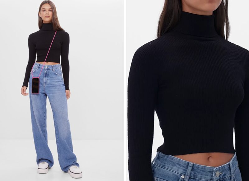 Es un modelo corto de manga larga y cuello alto perfecto para el periodo de entretiempo. Confeccionado en viscosa (50%), poliéster (30%) y poliamida (20%), forma parte del programa Care for Fiber. Este indica que al menos un 50% es viscosa, una fibra que se obtiene de bosques gestionados de manera sostenible. De esta manera, la marca reafirma su compromiso por el cuidado del medio ambiente.