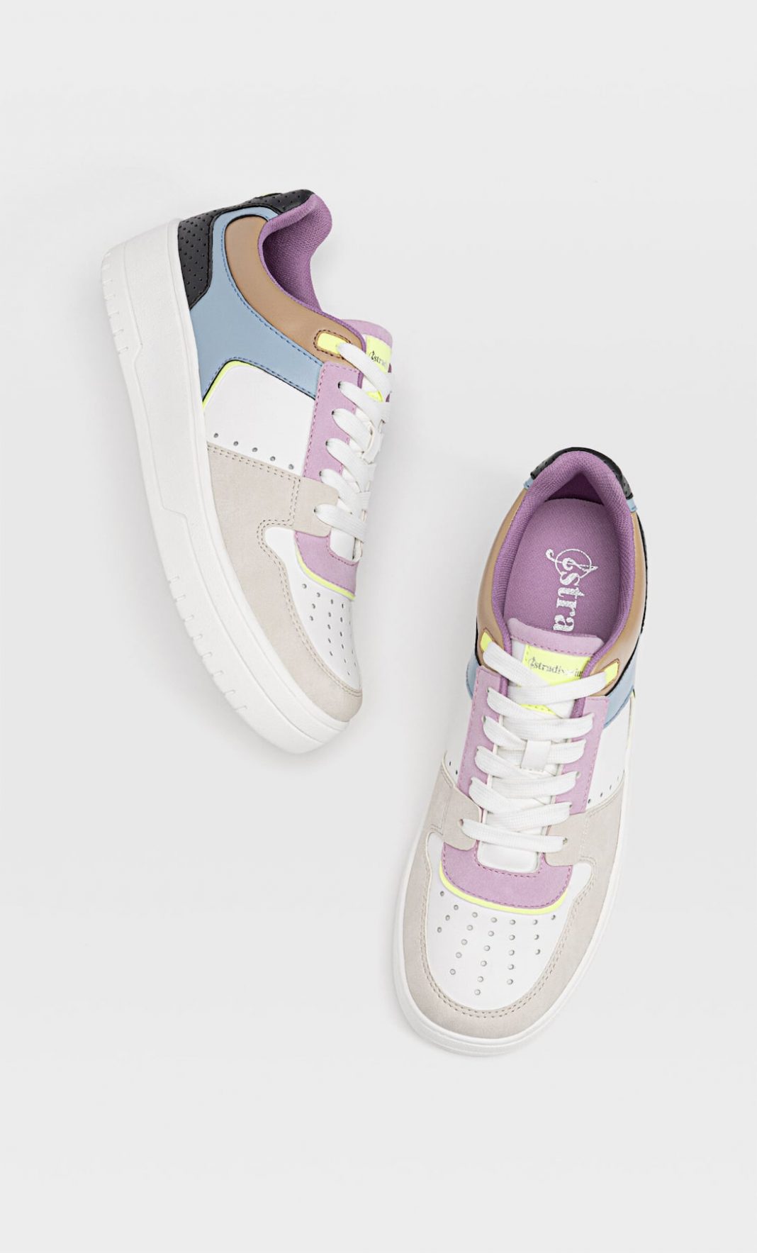 Comenzamos esta visita a Stradivarius con unas zapatillas deportivas en varios colores, con multipiezas y puntera perforada. Las tallas no tienen que ser un problema porque van de la 35 a la 41. Lo más llamativo de este modelo es esas piezas en diferentes colores que dan un aspecto muy chulo.