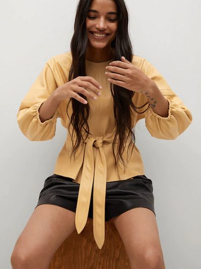 De este modelo de blusas nos gusta el precio, porque pasa de 29.99 euros a 19.99 euros (33% de descuento), pero sobre todo porque es uno de los modelos más chulos que hemos encontrado en Mango. Esta blusa tiene el efecto piel. Es un diseño ancho con cuello redondo y con manga larga abullonada.