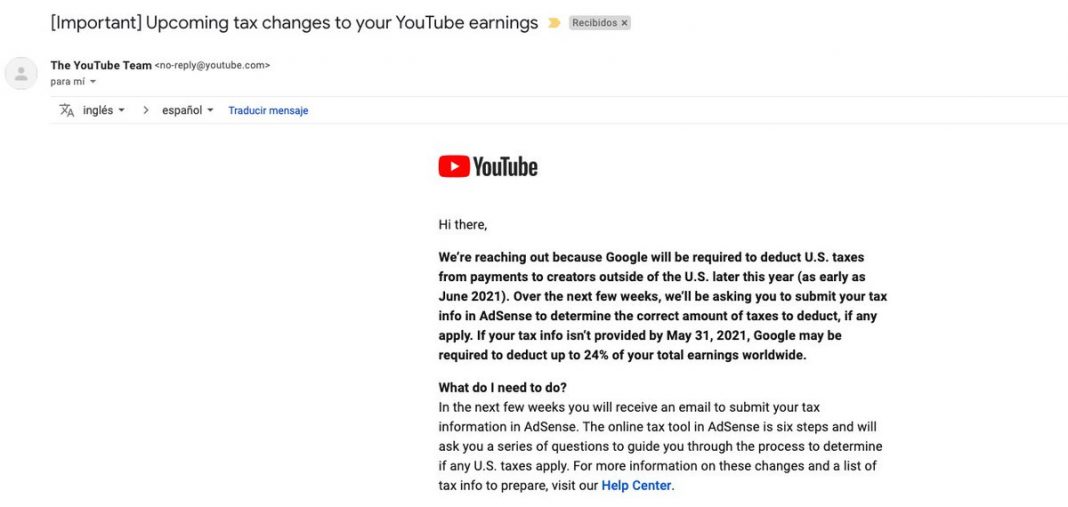¿Por qué ha pasado esto? Pues porque Google ha tenido que aplicar estos cambios para cumplir con el Capítulo 3 del Código Fiscal de Estados Unidos. Allí dice que «una empresa tiene la responsabilidad de recabar la información fiscal de todos los creadores de contenido que moneticen su contenido y residan fuera de Estados Unidos, así como de aplicar retenciones de impuestos a quienes obtengan ingresos procedentes de usuarios de dicho país». Nos gustaría ver un vídeo de los youtubers cuando conocieron la noticia.