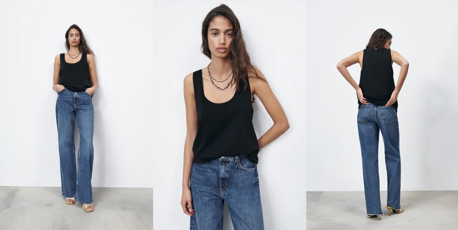 Un modelo muy parecido al que te hemos enseñado en la página anterior. Se trata de una preciosa camiseta negra con manga sisa en color negro que combina perfectamente con casi cualquier falda y pantalón. Siempre es aconsejable tener un buen fondo de armario y tener en el, por lo menos, una camiseta básica blanca y otra negra. Pertenece también a la colección Join Life y vale 7,95 euros en la web oficial de Zara. El fabricante indica que el algodón utilizado para la fabricación de esta prenda ha sido cultivado utilizando únicamente pesticidas y fertilizantes naturales.