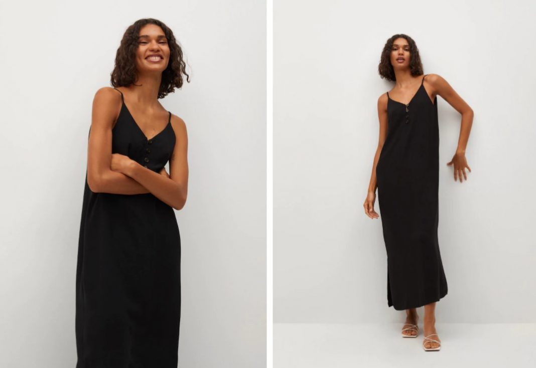 En este caso, hemos elegido este vestido largo de Mango para incluir en nuestra selección de prendas para la próxima temporada. Cuenta con escote en pico, muy favorecedor, tirantes espagueti y botones delanteros en el mismo color.