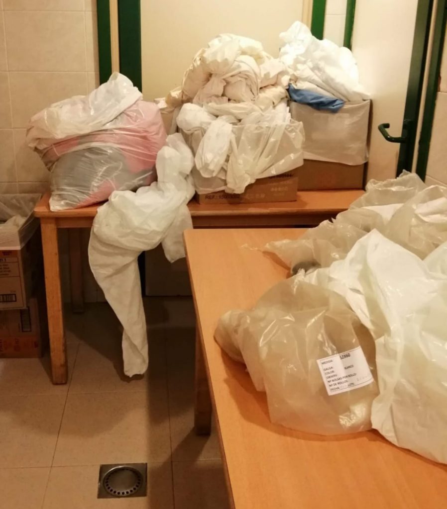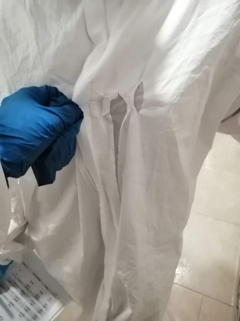 En las instantáneas, tomadas antes y durante el primer estado de alarma, se observan roturas en los trajes de protección personal -conocidos como EPIs-, o bien se confeccionaron con bolsas de basura; la ausencia de mascarillas y guantes era también la tónica en este inmueble. Los que había eran de compra, y si se proporcionaban, se rompían rápidamente al inicio del turno. «Cuando venía la inspección se recortaban bien las bolsas de basura; mientras en el resto de días se desgarraban por las prisas», ha reseñado.