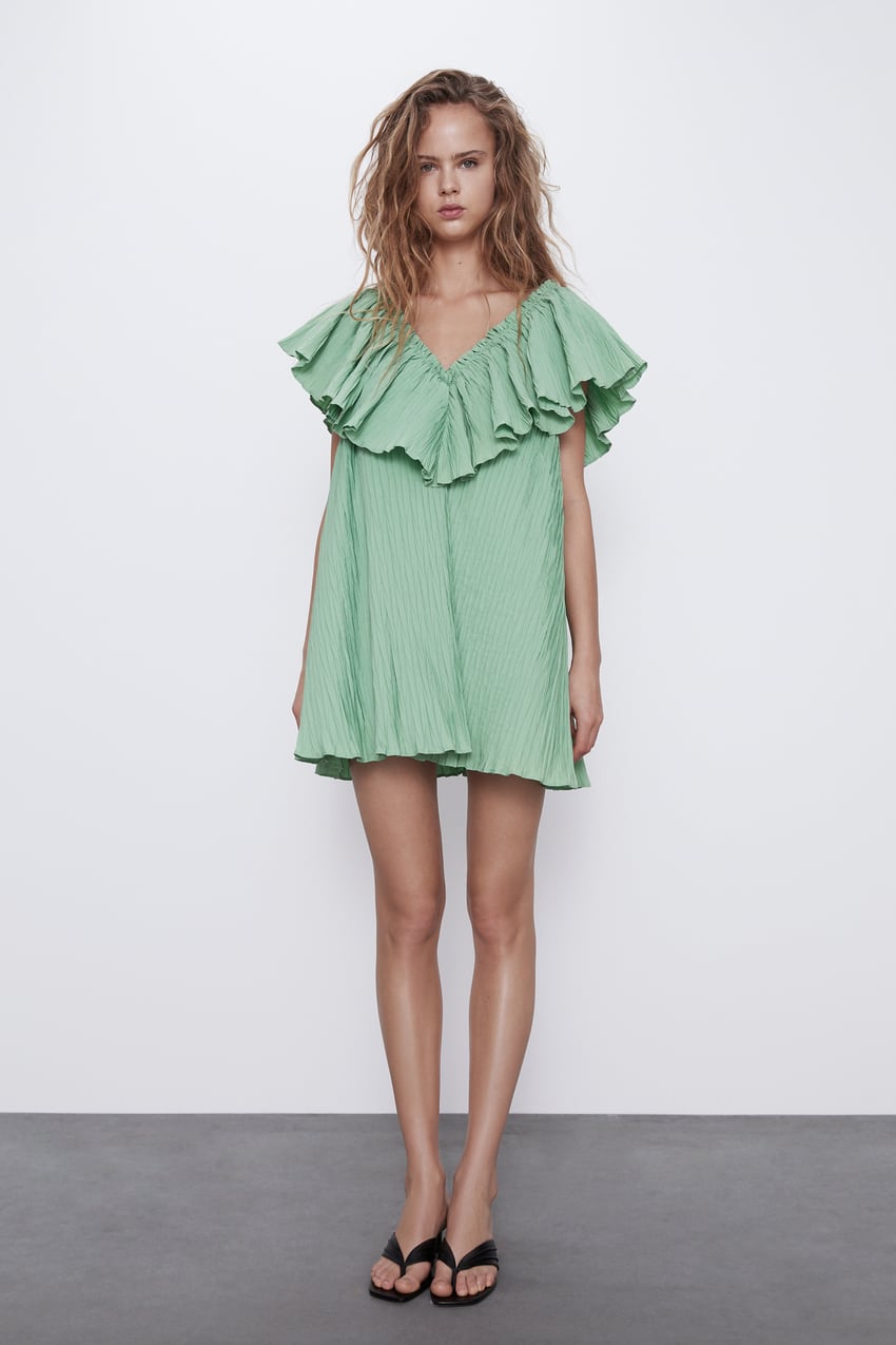Otra de las tendencias de la temporada y que Zara quiere que incorpores a tu armario es algún vestido con volumen. De hecho, como sucede con frecuencia, se llevan tanto los vestidos ajustados a la silueta como otros con gran volumen como este que nos dan un aire más sofisticado. Este en concreto es una maravilla gracias al tono verde pastel, el toque minifaldero y el volante del cuello. También lo tienes por menos de 30 euros.