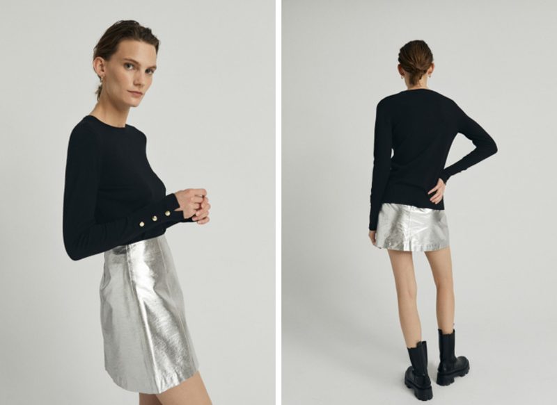 Se trata de una falda mini metalizada que posee abertura y cierra trasero de cremallera. Disponible en tallas limitadas por 10,75 euros (PVP: 35,99 euros), está confeccionada con viscosa (86%) y poliamida (14%); y con un forro de poliéster (100%).