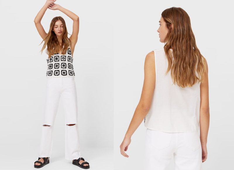 A la venta por 25,99 euros, es un chaleco que tiene el escote de pico y manga sisa, con tejido a crochet 100% algodón. Tiene un color crudo que se ve combinado con un estampado de figuras cuadradas que están presentes en toda su parte delantera. En la trasera es completamente liso.