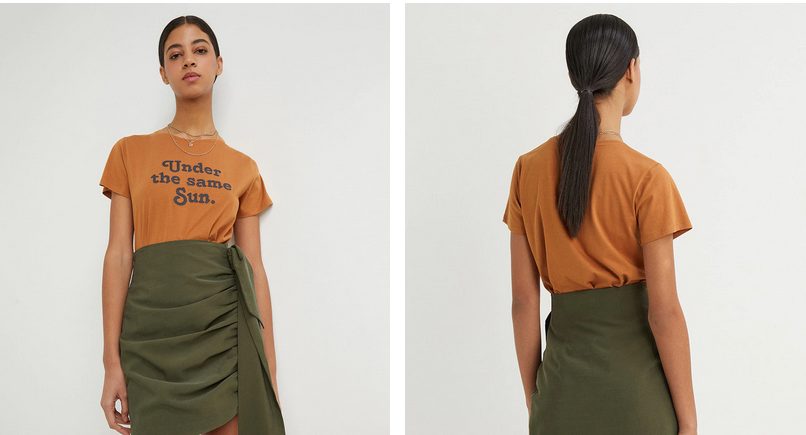 Terminamos nuestra visita a la página de Sfera con esta camiseta de mujer mensaje bordado y manga corta. Es decir que lo tiene todo. En primer lugar un mensaje que nos invita a disfrutar del verano y es que quiere decir ‘Bajo el mismo sol’. Como puedes ver viene en color marrón claro. El único. Y por solo 7.99 euros.
