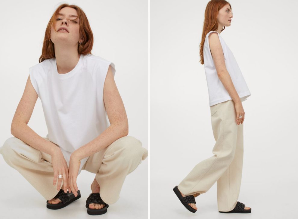 Una de las prendas más versátiles que encontramos en la sección de camisetas de H&M es esta, en color blanco impoluto, sin mangas. Lisa por completo, cuenta con hombros subidos que captarán todas las miradas.