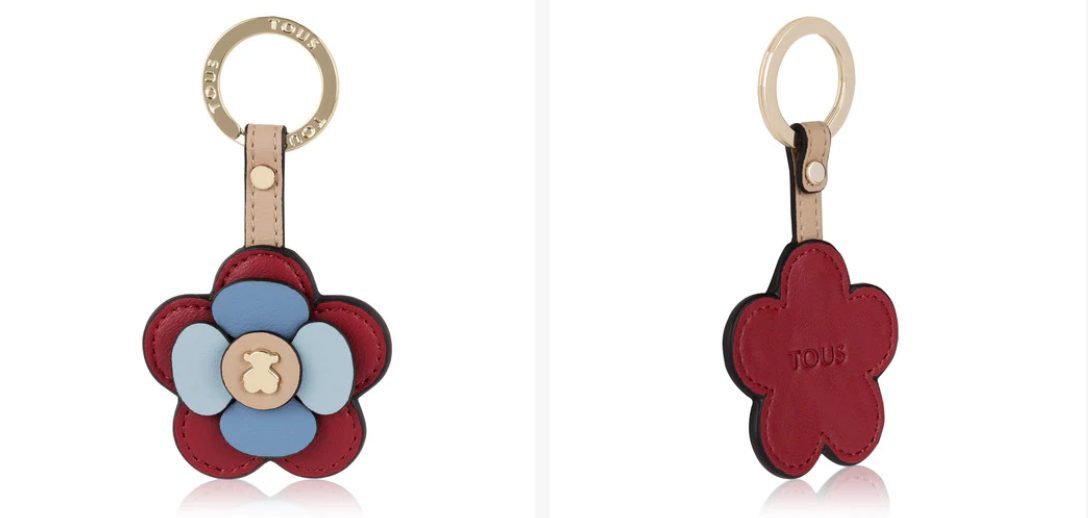 En este caso, elegimos este llavero en forma de flor, en colores rojo y azul, creando contraste, que cuenta con el famoso osito de la marca en el centro y el nombre grabado en la parte de detrás.