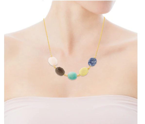 Se trata de un collar TOUS Terra de plata vermeil con aventurina azul, gaspeita, amazonita, cuarzo ahumado y ópalo rosa. Gema: 1,6×1,4 cm. Largo: 45 cm. Está recubierto de plata de primera ley recubierta de oro de 18kt con un espesor de 3 a 5 micras y sin ningún otro metal entre ambos. Una elección con la que siempre ganas.