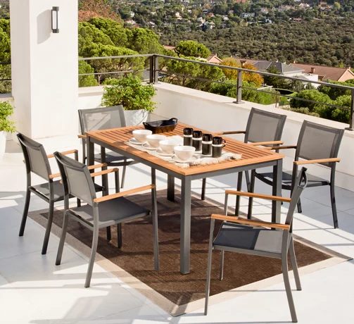 Llega el buen tiempo y es el mejor momento para comenzar con las tardes y noches de jardín y de terraza con amigos. Y lo vamos a hacer con un conjunto de muebles en Leroy Merlín. En este caso el kit viene compuesto por una mesa (150 x 89 x 74,6 cm) y set de 6 sillas (55,2 x 55,2 x 84,5 cm) fabricado en madera y aluminio con un acabado castaño ideal para disfrutar de jornadas al aire libre en tu jardín o terraza.