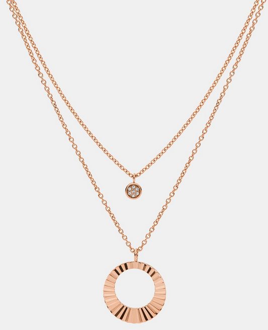 La primavera es la estación ideal para lucir joyas, ya que no vamos cargadas con abrigos, gorros de lana, bufandas y guantes. Los collares, por ejemplo, se prestan a vestir los escotes de blusas, vestidos y tops más ligeros, aportando un punto personal a cualquier estilismo. Una propuesta que nos ha gustado mucho de El Corte Inglés es este collar doble de la marca Fossil, fabricado en acero rosado y con detalles de glitz, La medida es de 40/18 cm + 5 cm y tiene un cierre de mosquetón práctico y seguro, con cadena extensora. Tiene un precio de 59€.